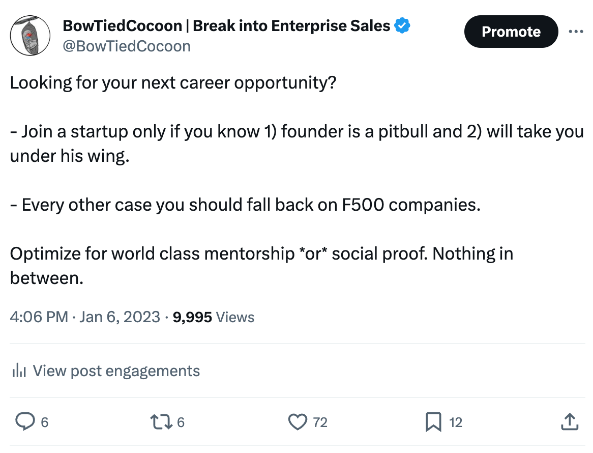 For every success stories, there are 1000+ sales reps that wasted YEARS they will never get back working at the wrong place (Cocoon exaggerated assumption).